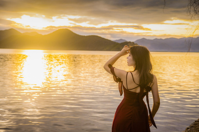 Damos un giro a lo largo de todo el lago Liaoyu y encontramos que la playa de los amantes era la mejor. Hay dos playas de amantes en el lago Liuhu, una en Yunnan y la otra en Sichuan. Lo curioso es que las flores de álamo acuoso de las dos playas de amantes florecen muy bien, y la superficie del agua es muy tranquila, y puede fotografiar el reflejo de las flores y las montañas. Además, entramos en el muelle de Rig, el álamo acuático cerca de este muelle también está muy bien abierto, pero el viento de Rig es más fuerte, no es muy capaz de fotografiar el reflejo.