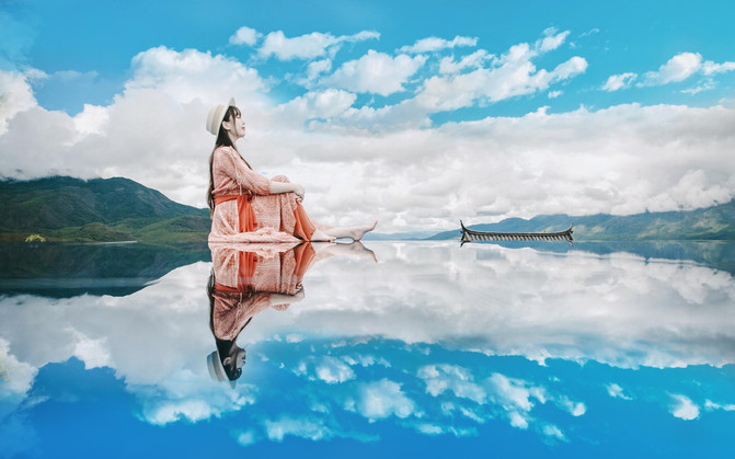 Bajo el cielo azul y las nubes blancas, todos los paisajes naturales que se pueden ver se reflejan en este "espejo del cielo", con una falda larga, bailar a voluntad, ya sea de pie o sentado, ya sea frontal o trasero, estático o dinámico, sin duda puede satisfacer al amante de la belleza.