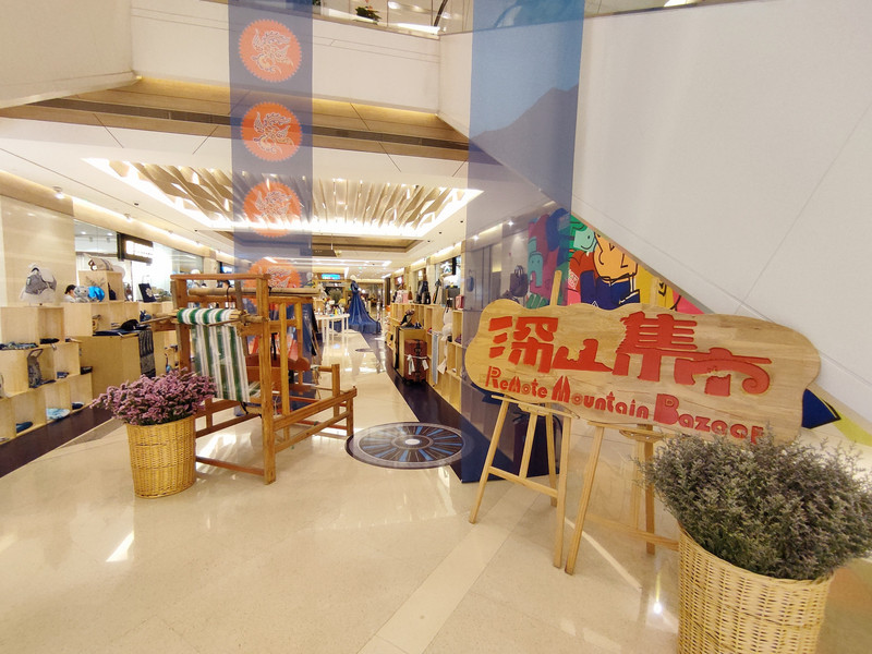 Entrando en el piso subterráneo del centro Kerry de Beijing, todavía totem, todavía azul batik, rodeado de la feria de montaña profunda, como un paisaje tranquilo de montaña profunda. El estilo de madera original, la cesta de bambú tejida de paja con grandes flores secas y el antiguo telar artesanal permanecen allí en silencio, lo que es particularmente llamativo en el centro comercial con un fuerte sabor comercial.