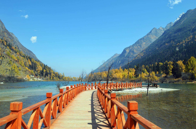Bipenggou tiene una belleza colorida, árboles verdes, hojas rojas profundas, cielo azul, nieve blanca pura, Bipenggou en octubre es el mejor lugar para ver las hojas rojas.