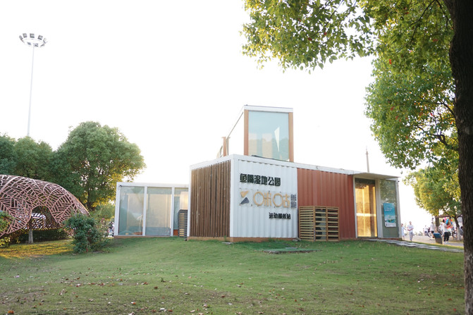 El parque es un parque público, no se requiere entrada, escanear el código del lugar para entrar. El parque da a la gente la sensación de gran altura. Al entrar es una ciudad gastronómica de autobús. En lugar de elegir el camino de la ciudad de autobuses, elegí este camino no recorrido. Aquí hay un edificio de contenedores de estilo elegante.