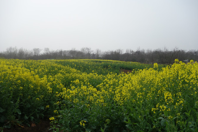 A lo largo del camino, los campos son flores de colza amarillas brillantes.