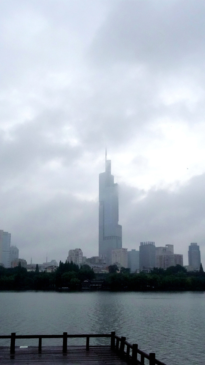 El área de agua en la foto es el Lago Xuanwu, inmediatamente entrar en el Lago Xuanwu nublado de lluvia