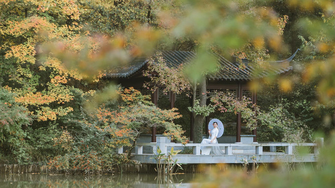 Con un paraguas en la mano, de pie en el pabellón, el otoño aquí es fuerte.