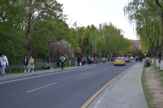El lago en un lado ondula y la carretera serpentea en un lado. Las plantas acuáticas están plantadas en la línea de agua. Hay ácaros, caña, cebollas y algunos que no puedo nombrar. Los sauces colgantes, camellia, palmeras, garras de pollo y osmanthus, ciruelas y flores de melocotón adornan la ladera de la orilla, y tienen un paisaje durante todo el año.