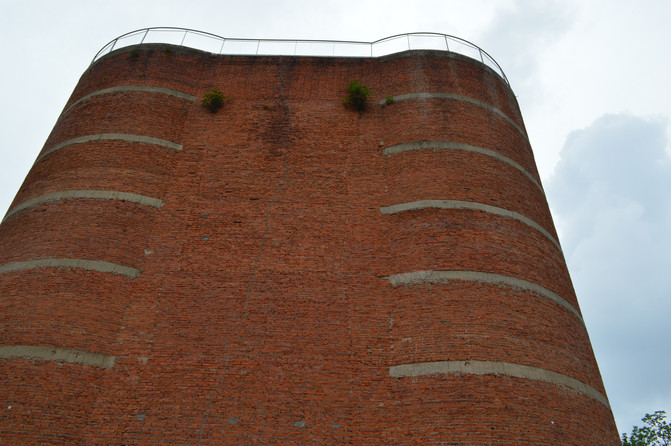 El perímetro del edificio es un lugar al aire libre cercado por ladrillos rojos. Las paredes de diferentes alturas y los escalones están hechos de ladrillos rojos, que se ven bien rodeados y adornados con verde.