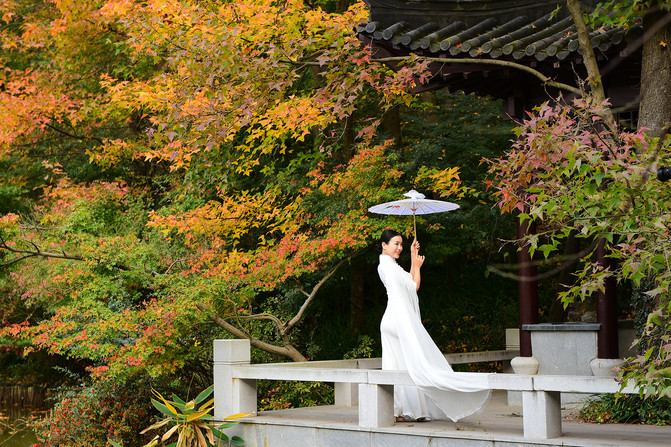 La bella bailarina de faldas largas camina por el camino, lo que agrega dinamismo y elegancia a este color de otoño. A ambos lados de la carretera, hay arce rojo, haya, arce, arce triangular, arce pentagonal y otras especies de árboles diferentes, por lo que los colores también son coloridos.