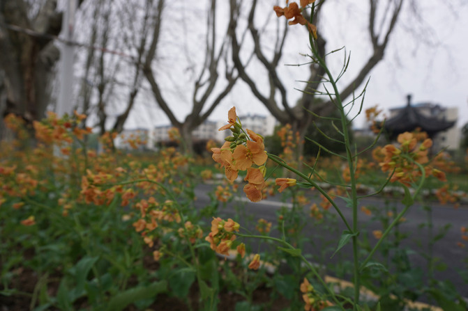 Flores de colza que florecen bajo los árboles. Cada centímetro de tierra de la Academia de Ciencias Agrícolas no traerá desperdicios, se plantará flores y hierbas.