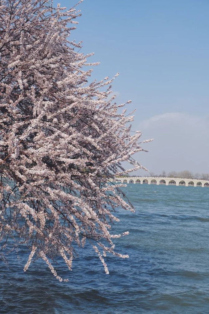 Lo primero que se ve es la flor de melocotón de montaña en el Palacio de Verano, que florece a lo largo del dique occidental, y las ramas se extienden en el lago Kunming azul pálido, que es el color rosa y azul más hermoso.