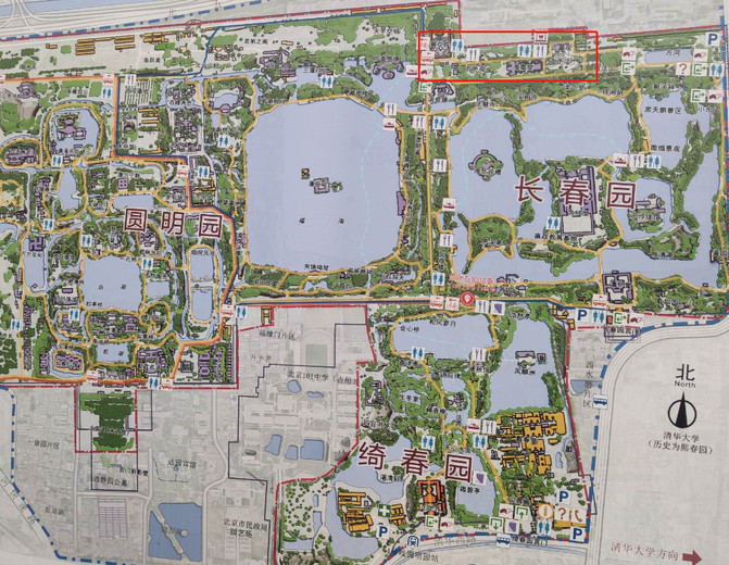Yuanmingyuan es muy grande, se puede ver en la imagen, se centra en el área enmarcada en rojo