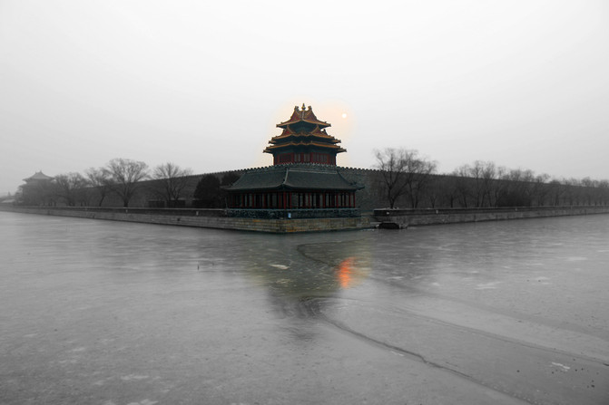 Luego caminó hasta la torre de la esquina noroeste y la torre de la esquina noreste de la Ciudad Prohibida. Este es el punto de disparo clásico de Beijing, pero la niebla de hoy es pesada, y el hielo en el río no es ideal.