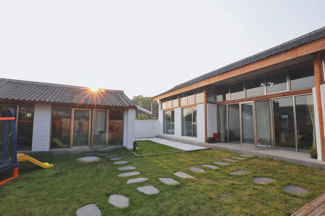 Tan pronto como entré en el patio, un camino pavimentado con pizarra en el césped me atrajo lo suficiente. Este diseño especial no intencionalmente da a la gente una sensación de caminar en la naturaleza. Caminando a lo largo de la pizarra, hay dos casas independientes a la izquierda, el comedor y la cocina a la izquierda, la sala de estar y 2 dormitorios a la derecha, y un sombrilla al aire libre en el extremo derecho. Puede sentarse debajo de beber un pequeño vino y charlar, ver la puesta de sol, arrepentirse de no preparar ingredientes de antemano para barbacoa en el patio. De lo contrario, podríamos pasar toda la noche aquí.