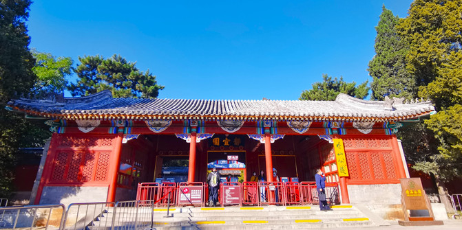 Por encima de la puerta principal del Palacio del Rey Celestial, la placa de poesía imperial de Qianlong colgaba.