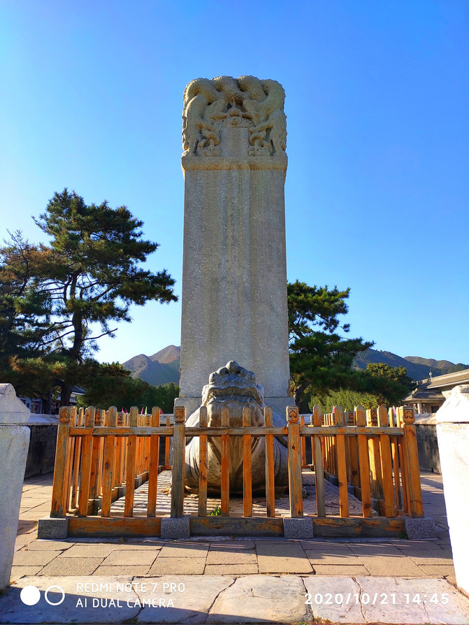 A lo largo del eje central del patio, hay una puerta de torre de dos columnas (puerta de la estrella de Zheng) y un conjunto de banquetes de piedra. Las dos columnas de la puerta de la torre de paleta están hechas en forma de cabeza, talladas en piedra blanca, con una sección cuadrada, y un dragón sentado tallado en la parte superior, y un tambor sostenido por piedra en la parte delantera y trasera. El banquete de piedra consiste en un archivo de ofrenda de piedra y un instrumento de oferta de piedra. La ofrenda de piedra consiste en un incenso (un), un candelabro (dos) y un jarrón (dos).