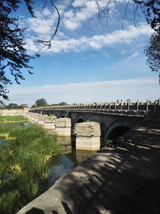 El puente Lugou es un puente de arco de piedra de 11 agujeros, construido en el tercer año de Jin Mingchang (1192 dC). El puente de Jin Zhang Zongding fue llamado "Guangli", y cambió su nombre a Puente Lugou debido a que cruza el río Lugou (es decir, el río Yongding). Más tarde, las dinastías Ming y Qing han reparado o reconstruido el puente Lugou.