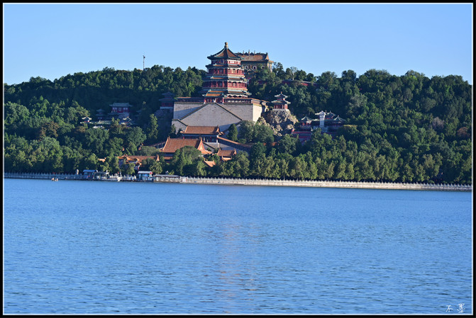 El cielo es muy claro, la superficie del agua parece más azul, la montaña Wanshou, la montaña oeste es verde esmeralda, la figura del pabellón del Buda se refleja ligeramente en la superficie del lago, al lago agregó un toque de hermoso color.