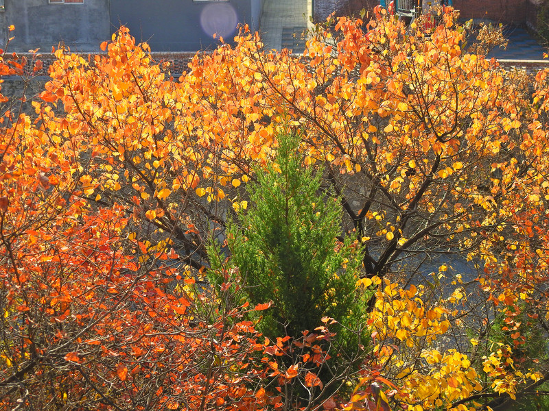 Pequeño pueblo con hojas rojas