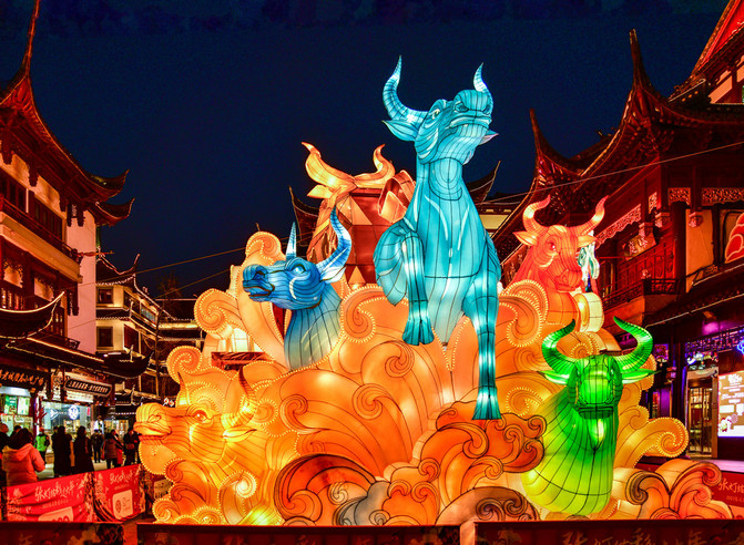 2021 Shanghai Yuyuan Festival de Linterna de Arte Folclórico de Año Nuevo, Yuyuan Mall Zhanglinter. La fiesta de las lámparas mostró una hermosa bendición del Año del Buey para "invertir la sequía", una escena alegre.