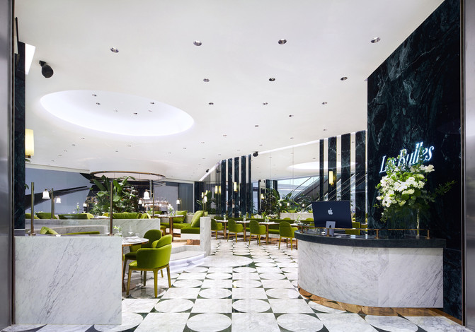 Entrando en Les Bulles, es más fácil impresionarse por el color, el mármol blanco con textura natural cubre el espacio, entre los cuales el espacio se divide en verde, como sillas de terciopelo y asientos de sofá, plantas verdes naturales como decoración de partición, luego adornadas con elementos de latón de todo tipo de adornos, un pequeño restaurante de champán moderno surgió, elegante y cómodo.