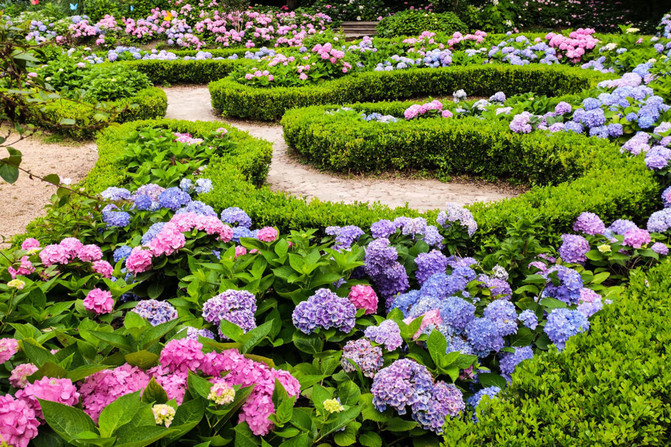 Los pisos de madera originales y los bancos de madera muerta en el parque temático están pintados con grupos de pinturas acrílicas de hortenas de colores brillantes. Las verdaderas y falsas flores de hortenida juntas, ¡es increíble!