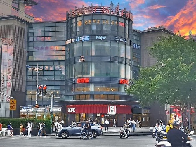 Aquí está la antigua ciudad de Qibao, ubicada al suroeste de Shanghai, en la intersección de Cao Bao Road y Wu Bao Road. Los rascacielos que se elevan se llaman Huibao Shopping Plaza Building, parecen gigantes imponentes bajo la brillante luz posterior.