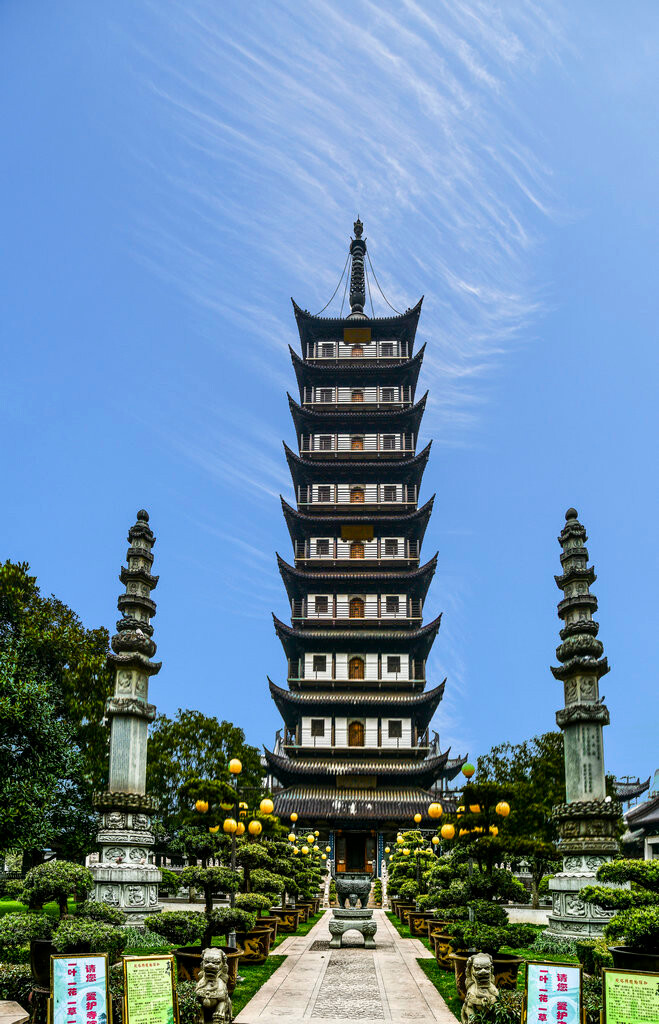 Detrás de la Sala Yuantong Bao hay una torre cuadrada de nueve niveles de 51 metros de altura, modelada digna, imponente en las nubes y extremadamente espectacular. La construcción de la pagoda comenzó oficialmente en septiembre de 1998 y se completó en un año y tres meses. El 24 de diciembre de 1999, el templo de Zhenru celebró una ceremonia de inauguración de la pagoda Zhenru. La construcción de la antigua torre no solo es un toque de pintura para la apariencia del templo, sino que también pinta el paisaje icónico para el turismo, el comercio y la comunidad de la antigua ciudad de Zhenru.