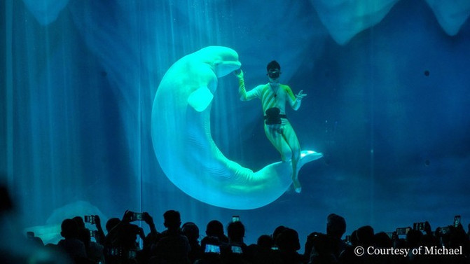 Bajo la guía de un cuidador, saltarán a veces fuera del agua y a veces en movimientos de remo. Cuando el cuidador recoge una varilla larga y está a más de dos metros de altura sobre la superficie del agua, saltarán del agua. De vez en cuando desde el agua emanaba un hermoso sonido, y el sonido etéreo resonó en el teatro.