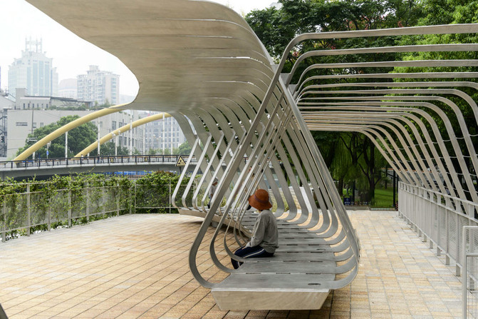 El "pavilón del río Su" también tiene bocetos paisajísticos únicos e instalaciones de descanso, como pabellones característicos, estanques de árboles, paredes escénicas características, etc., el más característico es el "pavilón de pájaros" en el lado oeste del puente de Wuzhen Road, su forma es como un pájaro que extiende sus alas, el diseño es muy fuerte, es un edificio icónico en el espacio.