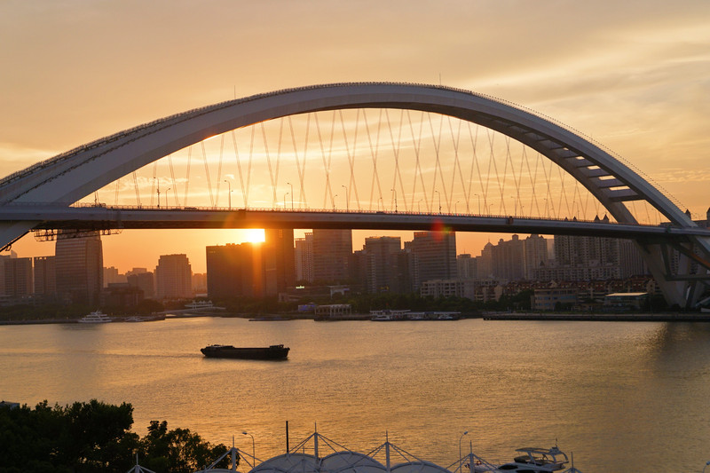 Una vez terminado, no te vayas y esperes a una romántica puesta de sol, con una excelente vista del puente Lupo y el río Huangpu. Afortunadamente, me encontré con una hermosa puesta de sol, la tarde rosa y púrpura llenó todo el cielo, contrapeso en el suelo de la terraza, como un espejo del cielo.