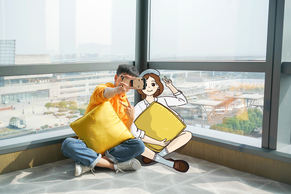 Luego hablamos de las habitaciones del hotel, cada una de ellas está equipada con una ventana de pared entera, y esta vez la habitación en la que se alojó incluso tenía dos ventanas de piso a terraza. En el momento en que entré en la puerta, las cortinas se abrieron automáticamente, y la ventana estaba frente a la estación de tren de Hongqiao.