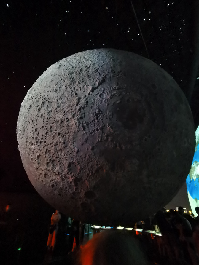 Por favor, aprecie nuestro hogar, que es el planeta más cercano a nosotros, la Luna. Tenemos una imaginación incomparablemente hermosa de ella, Guanghan Gong, Chang 'e. Por favor, mire su modelo real, donde es realmente un silencio y una oscuridad inalterables. El modelo se basó en imágenes holográficas de la Luna obtenidas por China.