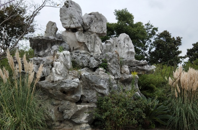 Al entrar es una montaña artificial, un poco apilada y no es escalable. La planta que hace el paisaje a un lado es el arroz, no sé cuál nombre el árbol ha perdido sus hojas, una vista muy otoñal.
