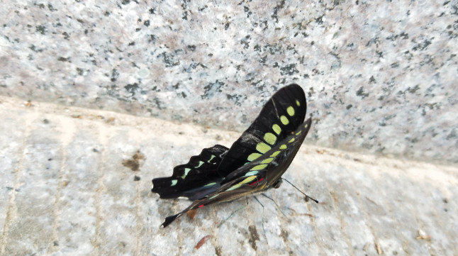 Una mariposa de feno azul se posó en el suelo en la puerta, no sé si es porque el vuelo durante el día está muy cansado, incluso nos acercamos antes de extender nuestras alas para escapar. Tampoco nos dimos el lujo de molestar sus momentos de ocio, observándolo un rato y caminando alrededor de él en el pabellón de exhibición agrícola.