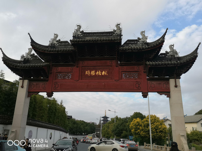 Fuera del Templo de Hanshan, hay un apéndice del nuevo lugar escénico más tarde, compuesto por el Pabellón Brahman y la estela de poesía de Huaxia. Debido a la oscuridad del atardecer, el efecto de la fotografía es pobre, solo como un recuerdo.
