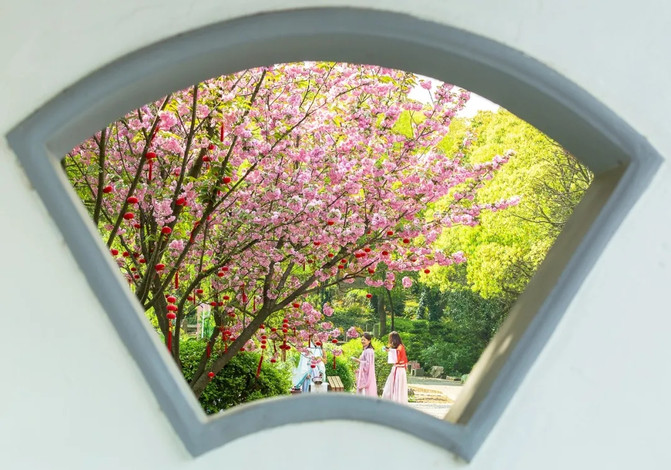 Los años son tranquilos, en la antigua ciudad de Guangfu en la montaña del lago y la cueva de Tianfu, tomando tu mano a través de la flor de cerezo en florecimiento en abril, es la fragancia del mundo.
