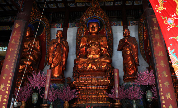 La escala de tres en cuarenta y ocho es bastante grande en el país. El salón de los arhats está centrado en cuatro piedras de escultura de montañas famosas, con quinientos estatuas de arhats dispuestas a lo largo de las cuatro paredes de la pared. Estas figuras de arhats son esculturas de barro, incluso más grandes que las personas reales, con diferentes expresiones y formas, y muy vívidas. El Luohan Hall