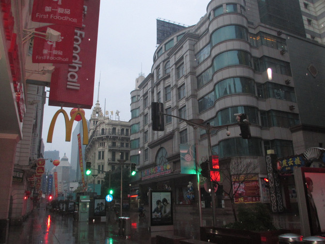 La lluvia ligera pronosticada llegó según lo programado. Temprano en la mañana, la calle peatonal de Nanjing Road desocupada en la lluvia es otro paisaje.