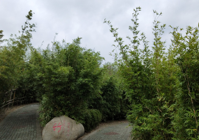 Después de entrar en la puerta, avanzamos a lo largo de la carretera izquierda, el primer tipo de bambú que vemos es el bambú de espigas pequeñas, también conocido como ruibarbo amargo, el bastón de bambú en forma de arbusto puede alcanzar 12 metros de altura, el bambú joven es púrpura-verde, el bastón viejo es verde-amarillo, la longitud del nodo puede alcanzar más de 30 centímetros. Debido a que crecen juntos, no han sido cuidadosamente podados, parecen un poco desordenados, pero hacen que la gente sienta que tienen una vigorosa vitalidad.