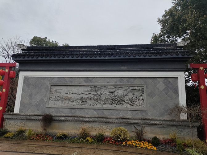 No muy lejos de la entrada hay una pared de relieve, esta pared debe ser construida más tarde, todo el relieve, por supuesto, está dominado por flores de ciruela, alguien en el pabellón acaricia a la ciruela, postura tranquila.