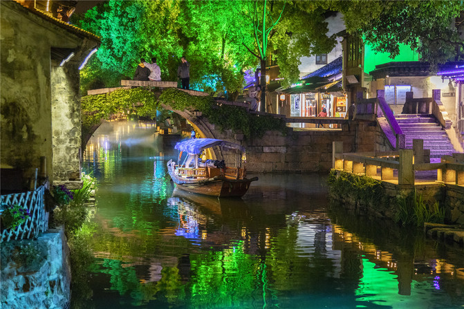 En Zhouzhuang, entre las nubes y el agua que fluye, en la esquina de la posada, siempre escuchará el melodioso tono del molino de agua, que cuenta las historias de la vida lenta pertenecientes a Zhouzhuang. Caminando por la noche en Zhouzhuang, "la belleza nocturna de la ciudad del agua - la ciudad antigua de Zhouzhuang" en la noche parece particularmente encantador, dejar a la gente emborrachada.