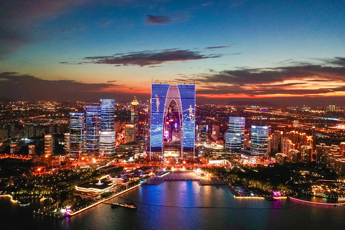 Fotografía aérea de la fachada exterior del hotel, edificio de vidrio azul, lleno de moda y modernidad. El desarrollo de Wu China Tai ha creado un espacio de vida cómodo en este lugar, complementado con el DoubleTree Hotel Suzhou Wu Zhong, el Garden Hotel Suzhou Wu Zhong Hilton y otros proyectos de apartamentos hoteles.