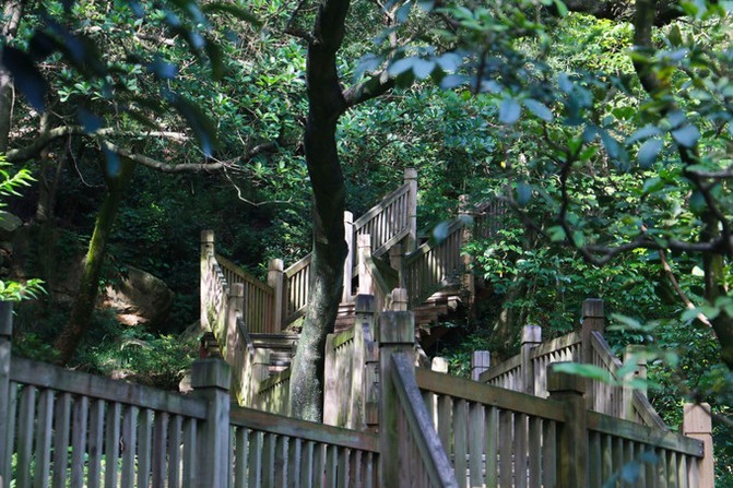 El camino a la derecha de la estatua de Laojun es un paseo por escalones de sabiduría. Hay varios paisajes a lo largo del camino, como la cueva Yuanyuan Tian, la plataforma del dragón, la plataforma sin polvo, etc., y camina hasta la torre de relicas del mago Hongyi.