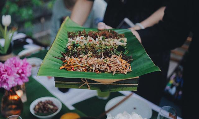Un día de verano ligeramente caluroso, un restaurante temático en el quinto piso de la ciudad de Vientiane, un nuevo refrescante "banquete de hojas verdes", la forma de una fiesta al aire libre, las chicas de Yunnan llevan trajes nacionales característicos llevando platos de hojas de plátano llevados lentamente a caminar, tienen una ilusión de estar en Dehong.