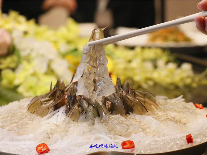 Sashimi de camarón, que el sashimi de material japonés, hoy en día Chaoshan práctica más encantadora, este plato de sashimi de camarón es más excelente, más sabor, delgado como alas de cigarra de carne de camarón transparente visible, despojar la cabeza de camarón solo para dejar la carne, levantado en forma de paraguas, puede ser un poco comprimido, entrada Q bala y tensión, en la sopa de camarón más tierna, carne de camarón fresca y dulce, dejar que el inmerso parezca convertirse en un decoración.
