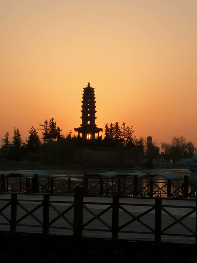 Salí del baño y acabo de caminar unos pasos. Cuando escuché la música sonando lentamente, era la música antigua china. Atraído por la música, me acerqué lentamente al reproductor en el césped y saqué el teléfono celular para grabar. La música entró lentamente en los oídos, como si hubiera llegado al presente desde el pasado lejano; o fluyó lentamente desde la cima de la montaña del sur final con la lluvia fluente. Me senté, escuché la canción, miré el lago bajo el sol atardeciente, la torre no muy lejos, y las montañas en la distancia... no pude evitar verter lágrimas.