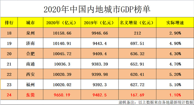 En ese momento, había siete ciudades con un PIB de más de 900 mil millones de yuanes, a saber, Quanzhou de Fujian con 994.666 mil millones de yuanes, Dongguan de Guangdong con 948.25 mil millones de yuanes, Jinan de Shandong con 944.34 mil millones de yuanes, Hefei de Anhui con 940.94 mil millones de yuanes, Xi 'an de Shaanxi con 939.998 mil millones de yuanes, Fuzhou de Fujian con 939.23 mil millones de yuanes y Nantong de Jiangsu con 938.339 mil millones de yuanes, Estas siete ciudades están a solo un paso de distancia de un billón de yuanes, y Nantong, la más pobre, es solo más de 60 mil millones.