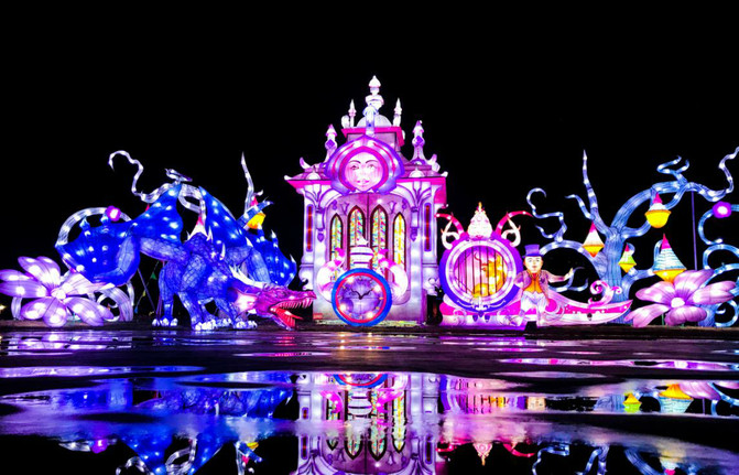 La entrada al castillo de ensueño, con luces de castillo de forma extraña, misteriosa y hermosa, tiene un poder demagógico en la noche. Adentro es el maravilloso grupo de luces de circo, la forma de monstruo combinada con colores brillantes traen un poderoso impacto visual, la enorme bestia de piedra con un carrusel, con dinosaurios mágicos, visitantes misteriosos de ensueño, un espectáculo único y maravilloso (las fotos son tomadas en vivo).