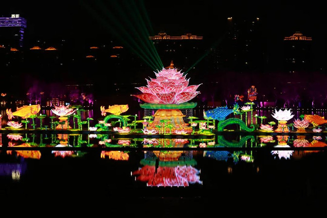 Visitar flores y ver la primavera, disfrutar de las lámparas. Las lámparas de flores de decenas de millas de fragancia, las cortinas de perlas sonoras de la luna, miles de luces magníficas se iluminan en la noche del hibisco, lo que le permite tener una experiencia de inmersión "en la pintura" en la belleza de la rueda. La brisa de primavera es suave, hay una gran luna en el paisaje de escalones de nubes, el parque de paseos vuela hacia el crepúsculo, las nubes se mueven, la lluvia, las olas de humo pintan barcos, el hermoso paisaje de la noche, la gran luz del sol, todo el panorama.