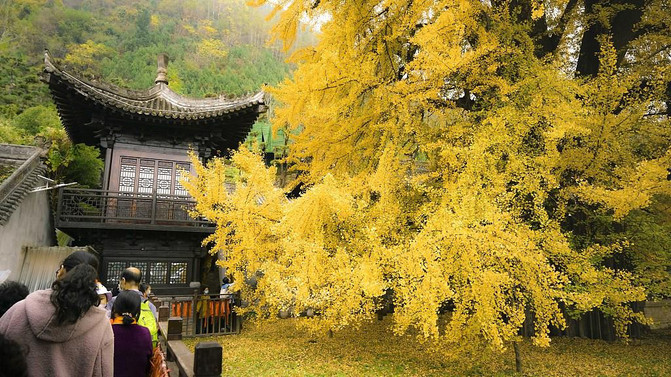 El antiguo templo Guanyin Zen es uno de los templos milenarios de la montaña Zhongnan, con una historia de aproximadamente 1400 años. El antiguo árbol de ginkgo en el templo es un testimonio de su viento y lluvia milenarios. Se dice que el árbol de ginkgo fue plantado por Li Shimin, el emperador de la dinastía Tang, cuando se construyó el templo Zen, durante más de mil años.Ahora, cada otoño, se cubre con una "armadura de guerra de oro", las hojas del árbol se vuelven amarillas, y la corona alta se ve hermosa, muy impactante. Las hojas caídas cubrían todo el patio, como si estuvieran cubiertas con una manta dorada. Mirando a lo lejos, de arriba a abajo, todo el cuerpo es dorado, lleno de aspecto real. Este árbol antiguo que viene del largo río de la historia parece contar en silencio la prosperidad de la dinastía Tang hace mil años.