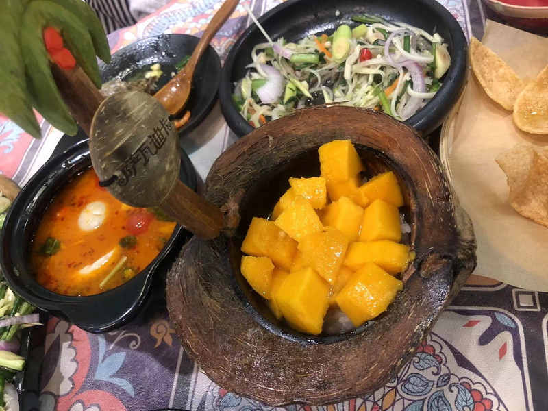Xi Ti amor coche Tu Yue, con una amiga a la Plaza Zhonghua para dar un paseo, a la cena, amigos y quiero probar la comida tailandesa que nunca antes había comido, luego entramos en un restaurante tailandés para probar, esta tienda en el quinto piso de Zhonghua, pertenece a una pequeña tienda abierta, la decoración es muy tailandesa.